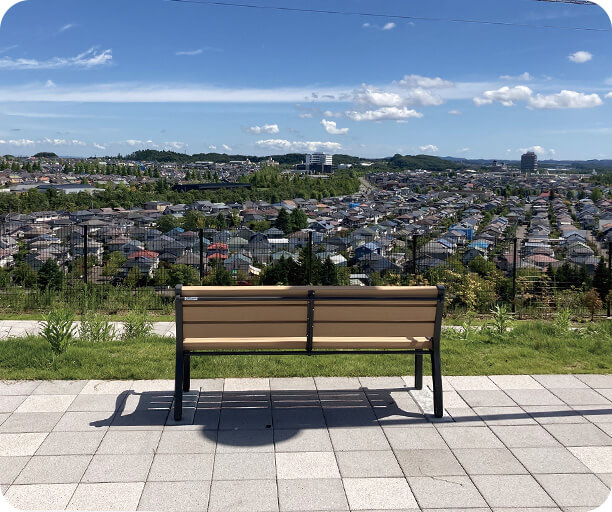 街の中央にある公園は、広さ約9,000㎡(南北約30m×東西約300m)。公園東側はフラットな芝生広場で、東端にある見晴らしの丘に設置したベンチは、泉パークタウンの眺望を楽しみながら憩える空間となっています。公園西側は、子供向け遊具だけでなく、大人も利用可能な健康遊具を設置し、世代を問わず楽しめる空間となっています。