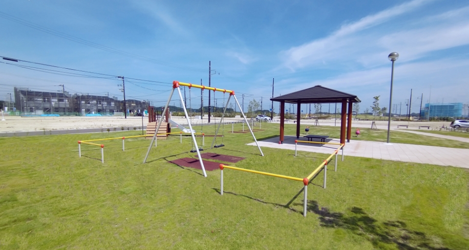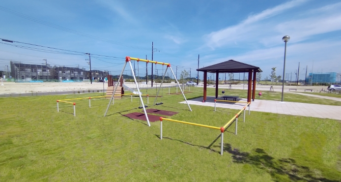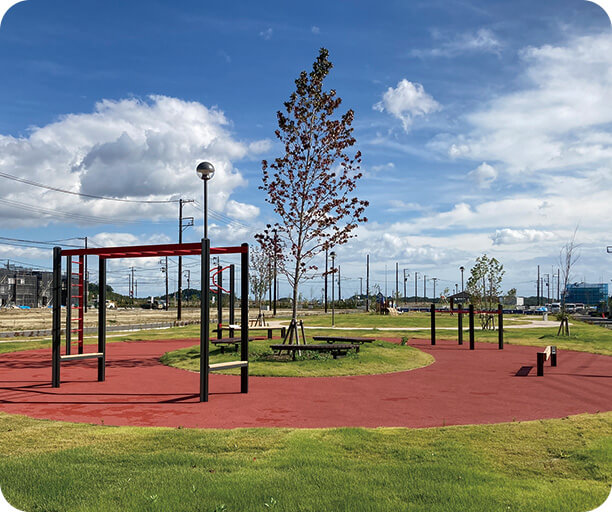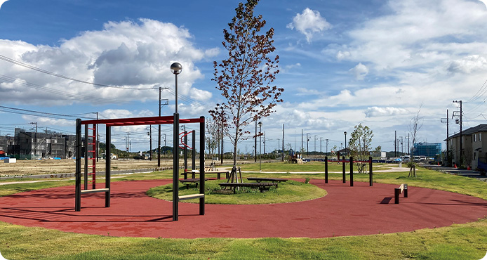 街の中央にある公園は、広さ約9,000㎡(南北約30m×東西約300m)。公園東側はフラットな芝生広場で、東端にある見晴らしの丘に設置したベンチは、泉パークタウンの眺望を楽しみながら憩える空間となっています。公園西側は、子供向け遊具だけでなく、大人も利用可能な健康遊具を設置し、世代を問わず楽しめる空間となっています。